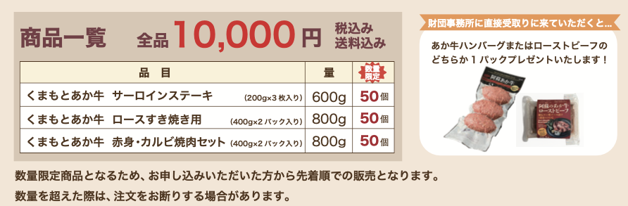 12月26日(金)までに事務所に取りに来ていただいた方には、あか牛ハンバーグ(3個入り)またはローストビーフ(薄切り)のどちらか1パックをプレゼントいたします。