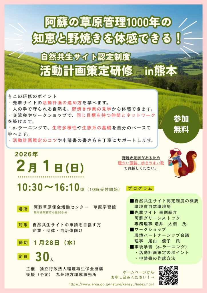このたび阿蘇グリーンストックが認定を受けている自然共生サイトが会場となり、『自然共生サイト認定制度「活動計画策定研修」in熊本』が開催されます。