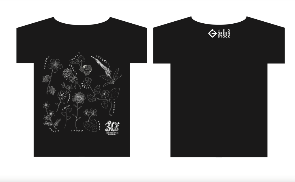 Tシャツには、職員が厳選した阿蘇特産の11種類の植物をデザインし、名前もプリントしました。このTシャツを着て、草原に色ぶちを観察しに行きたくなるようなデザインに仕上げました。